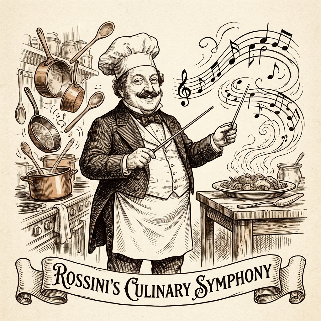 로시니가 말년에 남긴 피아노 소품집 《노년의 과오(Péchés de vieillesse)》를 보면 그가 얼마나 음식에 진심이었는지 알 수 있습니다. 이 작품집에는 '헤이즐넛', '무', '멸치', '버터' 같은 식재료의 이름이 제목으로 붙어 있습니다. 단순히 이름만 붙인 것이 아니라, 각 식재료가 가진 독특한 질감과 맛을 피아노 선율로 묘사하려 했죠.