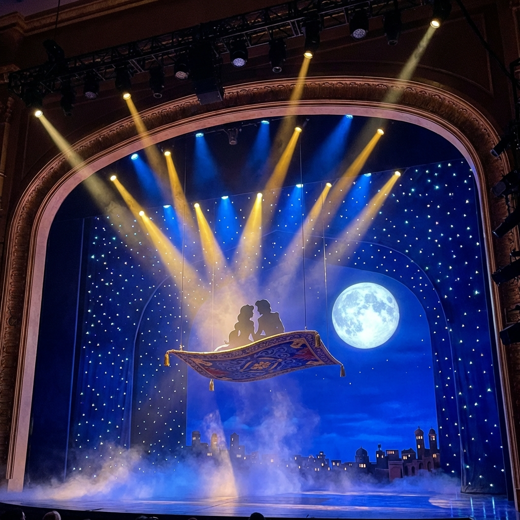 마법의 양탄자: 애니메이션에서만 가능할 것 같았던 양탄자가 무대 위를 자유롭게 날아다니는 장면은 관객들에게 잊지 못할 경이로움을 선사합니다.